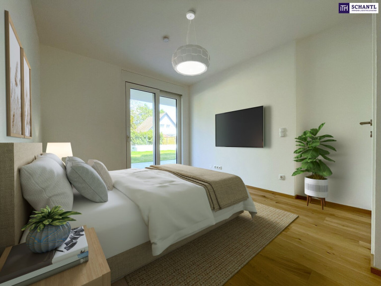 - perfekt geschnittenes Schlafzimmer mit ausreichend Platz für einen Kleiderschrank und Zugang in den Traumgarten