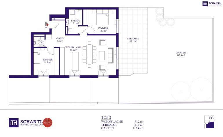 Wohnfläche: ca. 74,2 m² + Terrasse: ca. 33,1 m² + Garten: ca. 113,4 m² + Kellerabteil